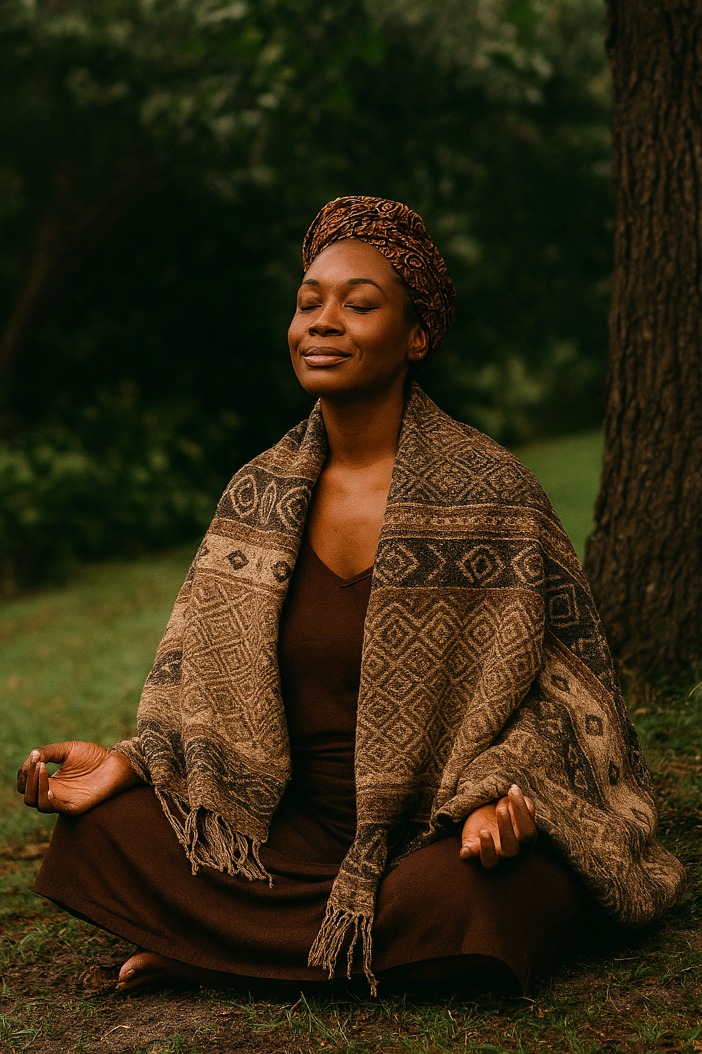 She finds her place beneath the oldest tree, its roots tangled like the lineage she carries. The bark is rough, the branches wide, and the leaves whisper stories only the soul can hear.